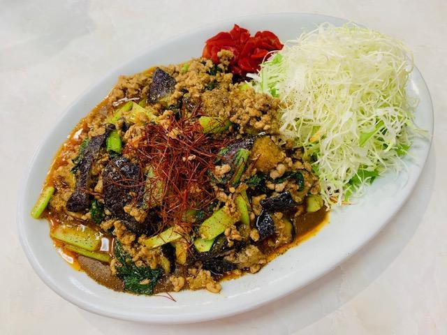 五香粉の風味の効いた本格タレに豚粗挽き肉と小松菜そして大きめにカットした食感の良い揚げなすを炒めてカレーの上にドサッと‼︎
